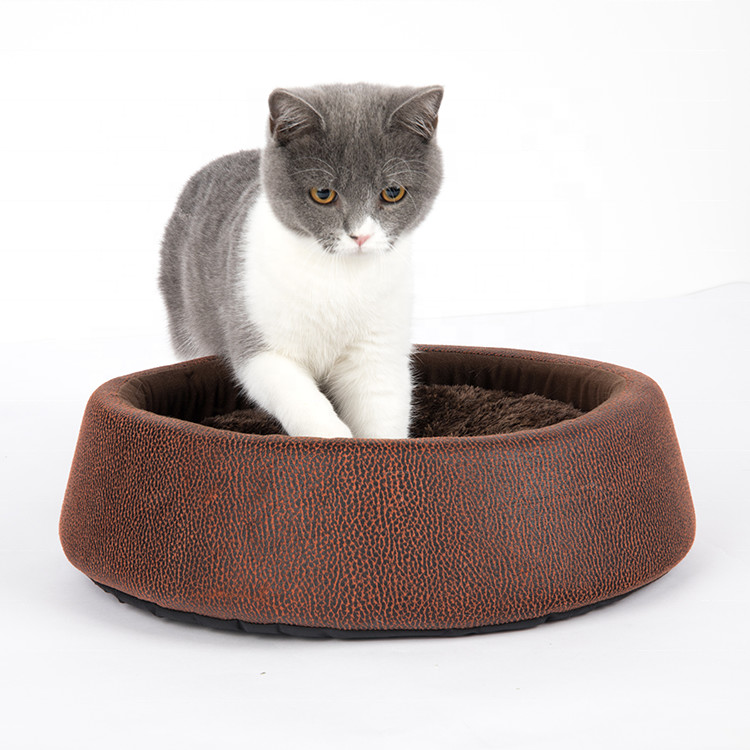 Weigth 270g Soft Round Cat Bed Brown Color PU Leather Material Customized Logo